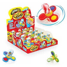 Sucette en forme de toupie, avec des pop it intégrés (célèbre jeu de bulles colorées en silicone dont le but est de les exploser), le tout sur un anneau pour porter la sucette en bague, goût fraise, pomme et framboise.